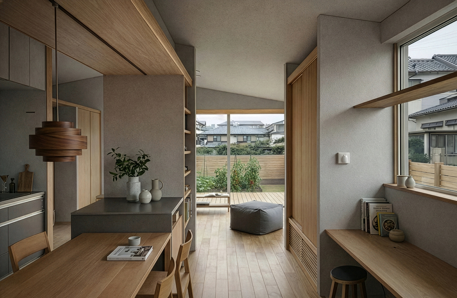 外観は、1階と2階の面積差による凹凸を抑え、総2階のように見せるワンボリューム設計により、端正な佇まいに整えました。外壁材に使用したダブル断熱の塗り壁が、あたたかみのある印象に仕上げています。玄関からパントリー、キッチン、リビング、洗面所、ウォークインクローゼット、脱衣所へとつながる回遊動線。キッチンには、料理やお菓子づくりに使えるコンパクトな作業台を備え、家事動線にこだわった間取りが実現しました。一方でご家族が静かにくつろげるようにこだわったリビングは、天井高に変化をつけることで、ダイニングからリビング、そして庭へと視線が自然につながり、開放感を生み出します。庭には深い軒とウッドデッキを設け、晴れた日はもちろん、雨の日でも家族で食事や日向ぼっこを楽しんだり、奥様が趣味のヨガや読書を楽しんだりと、セカンドリビングとして活用できます。さらに家庭菜園をができる庭では、季節を感じたなあら、育てる、収穫する、調理するという日常に加わり、暮らしの幅を豊かにします。2階にはご主人の趣味部屋を計画。約4畳の空間にあえて天井高を確保し、洞窟のような空間を木毛セメント板で仕上げたことで、静かにこもれる場所となりました。